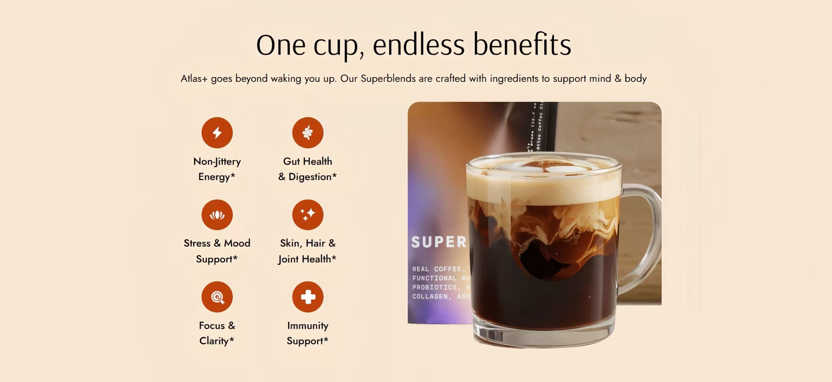 |   | Atlas+ Superblend | MushroomCoffee | GreenDrinks | Probiotics |